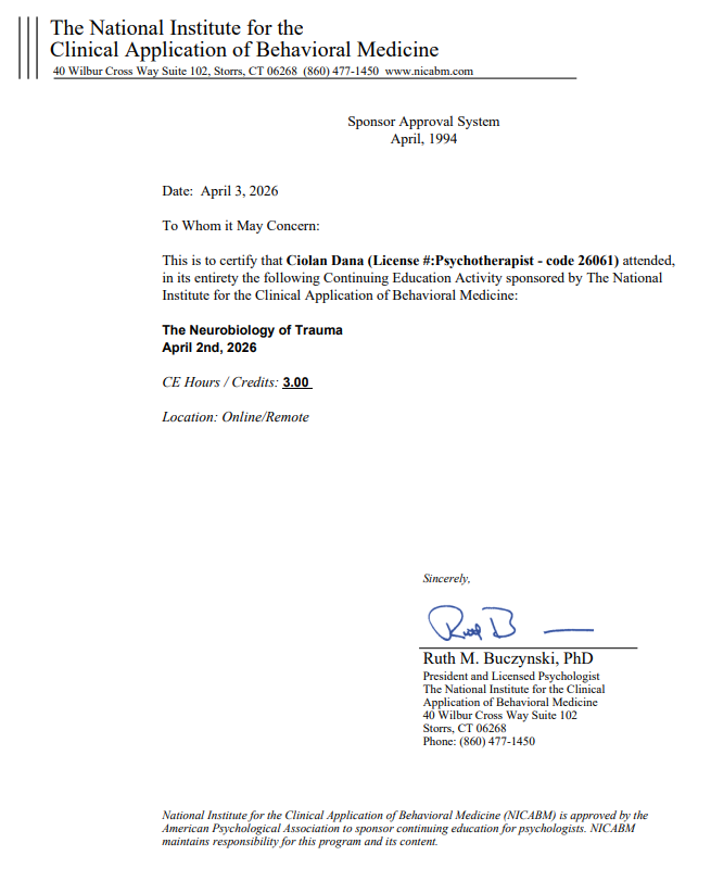 Bună! Numele meu este Daniela Elena Ciolan, sunt psihoterapeut integrativ și psiholog clinician, acreditat de Colegiul Psihologilor din România, Asociația Română de Psihoterapie Integrativă și Asociația Europeană de Psihoterapie Integrativă.